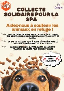 Dans le cadre de leur formation en BTS GPME 1ère année, les étudiants organisent une collecte solidaire au profit de la SPA afin de soutenir les animaux recueillis et les refuges qui en ont besoin.