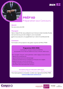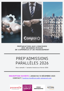 Comme chaque année, dans notre dynamique d’accompagnement de nos étudiants de BTS 2ème année nous proposons aux étudiants désireux d’intégrer une Grande École de Commerce et de Management après le BTS un module intensif de préparation aux Admissions Parallèles pour maximiser leurs chances de réussite aux concours (Passerelle 1, Tremplin 1, Accès, Ambitions+…).